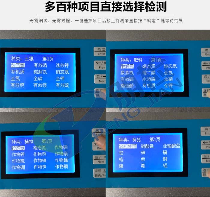 在第四代設(shè)計(jì)中,儀器重回經(jīng)典面板式主機(jī);無需空白和標(biāo)準(zhǔn)校準(zhǔn),一鍵式操作,直接讀取數(shù)據(jù);5.1寸大屏幕中文背光顯示;可檢測土壤33項(xiàng)、肥料31項(xiàng)、作物32項(xiàng)、食品15項(xiàng)共111個(gè)測試項(xiàng)目。